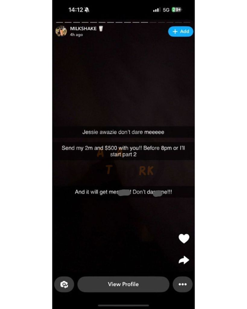 “Jessie Awazie don’t dare me. Send my 2m and $500 with you!! Before 8 pm or I’ll start part 2,” the message read. “And it will get messier. Don’t dare me!!!”