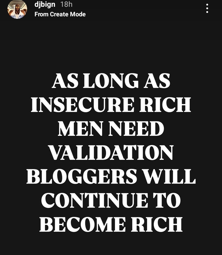 In his Instagram story, the DJ wrote, “As long as insecure rich men need validation, bloggers will continue to become rich.”