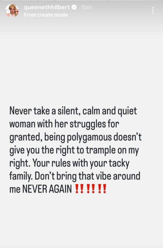 “Never take a silent, calm and quiet woman with her struggles for granted,” she wrote. “Being polygamous doesn’t give you the right to trample on my right. Your rules with your tacky family, don’t bring that vibe around me NEVER AGAIN!”
