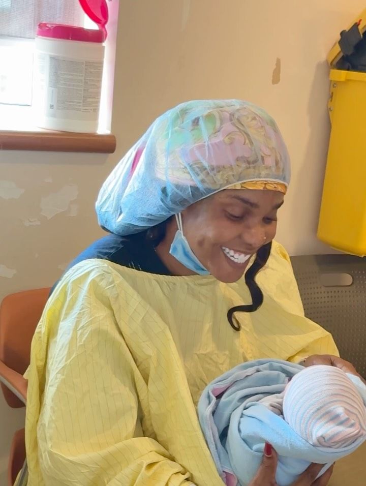 Priscilla’s mum, Iyabo Ojo, shows up in the ward. She beams wide while she holds the new child. The look tells calm, pride, and pure joy. Her mask drops low as she smiles for a snap.