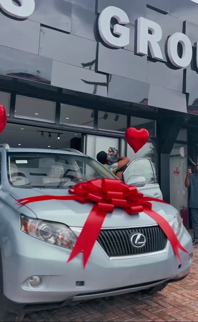 He gives her a clean, silver SUV with a red bow. Heart balloons float by the glass wall. Both share a long hug near the driver’s door. Phones come out as cheers rise.