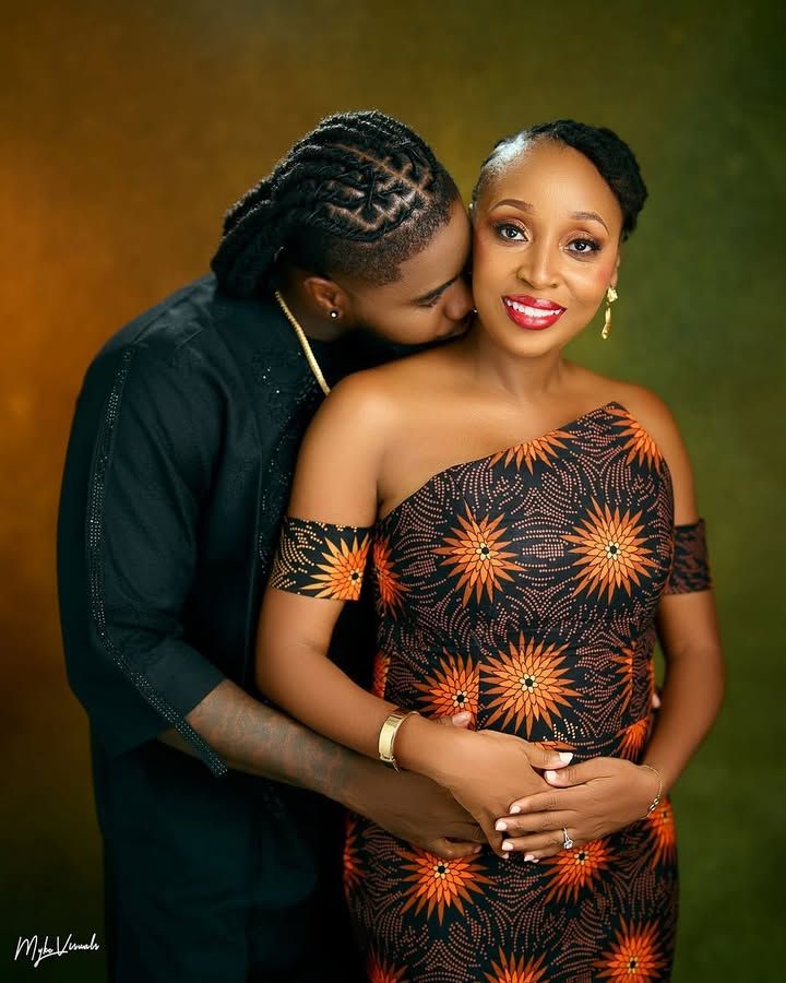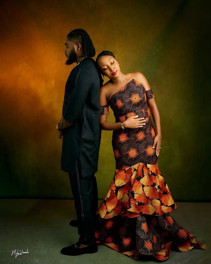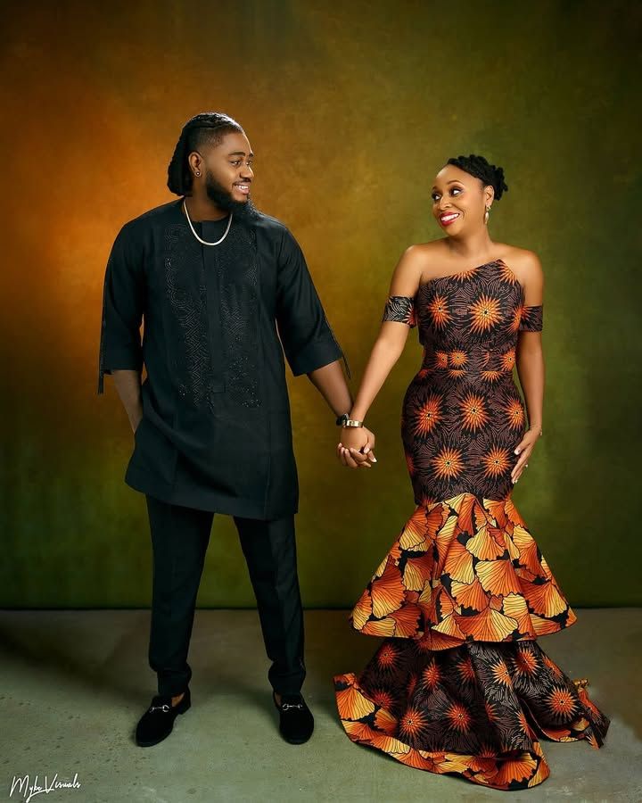 His look stayed sharp in an all-black native set. He wore a simple chain and black loafers to match. Meanwhile, she stunned in a one-shoulder, flared Ankara dress. The print mixed warm tones of orange, brown, and gold.