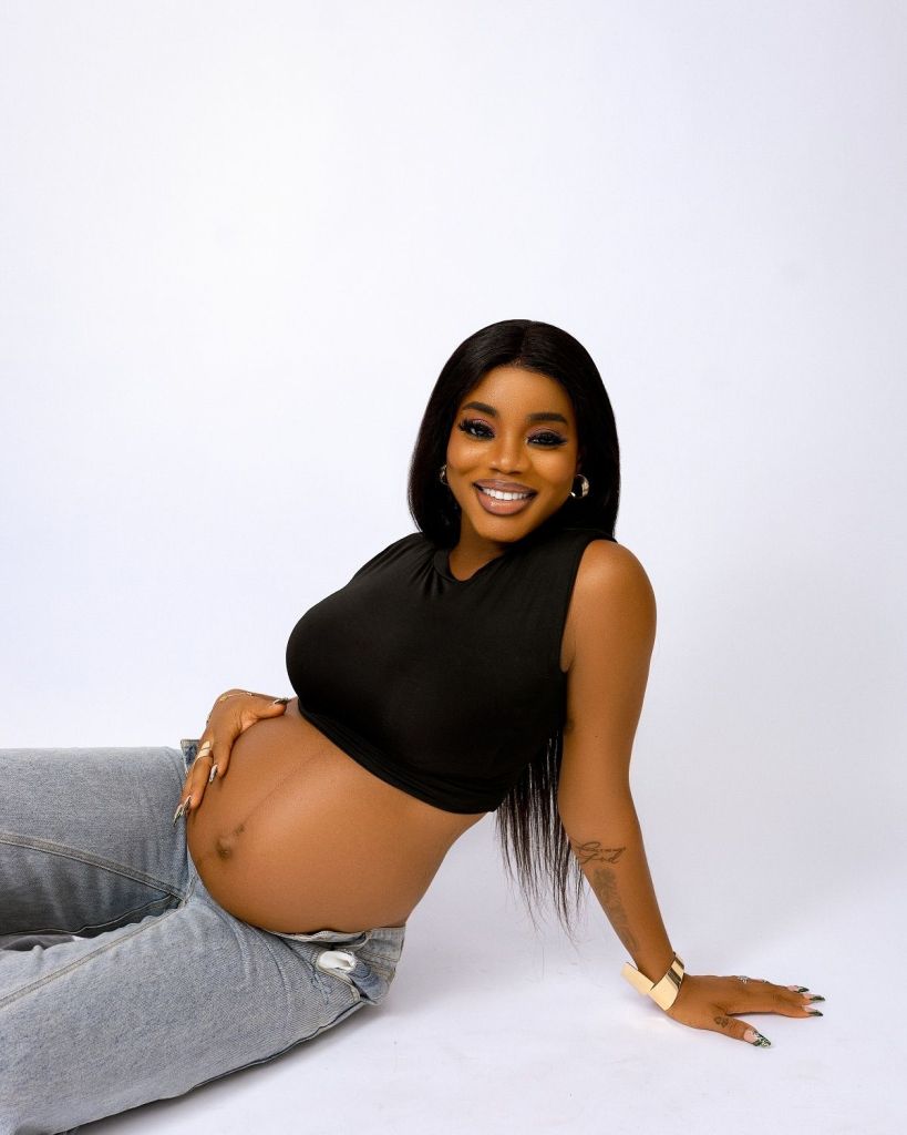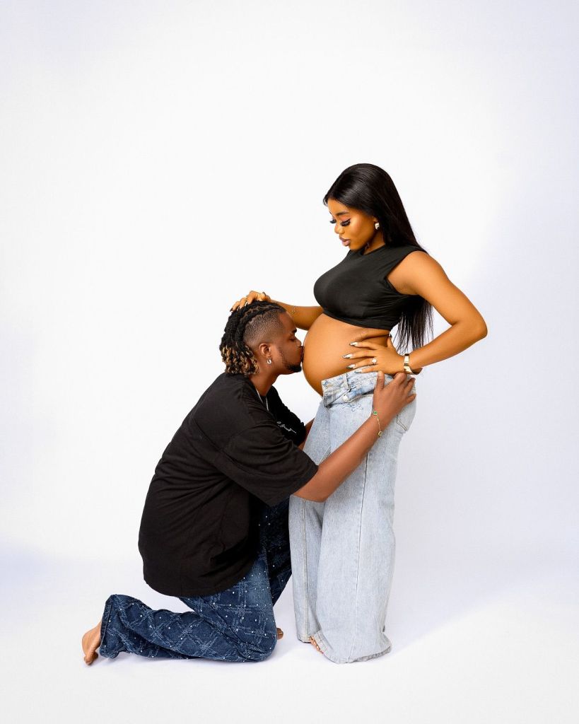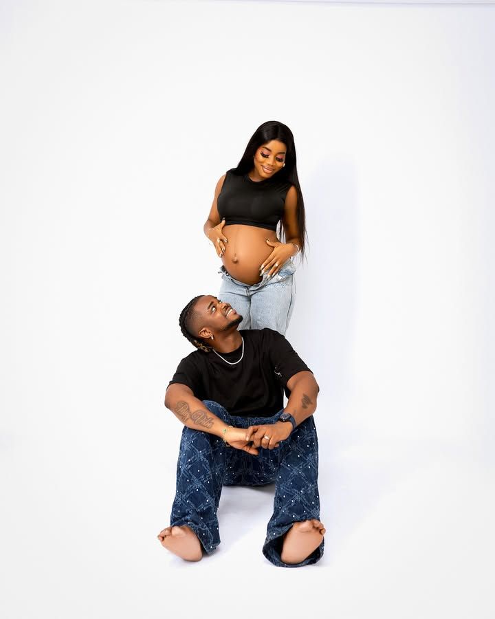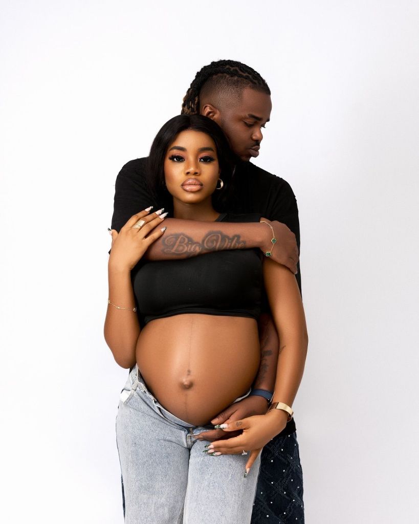 The first images come from a clean studio shoot. Chisom cradles her bump in a black crop top. Rexxie wraps his arms and holds her hands. Their smiles set a calm, warm tone.