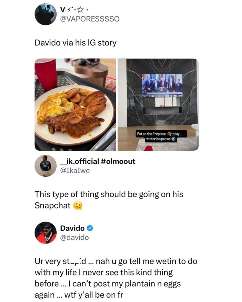 Davido’s Story showed a simple plate and a short clip. Soon after, a user on X shared a taunt. He faulted the choice to share a meal online.