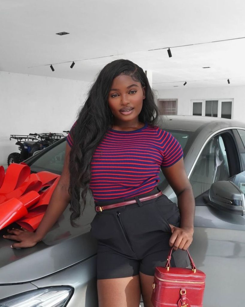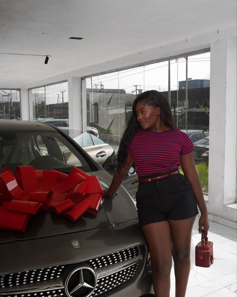 Online personality Raye has bought her first car. She posed by a grey Mercedes-Benz sedan at a showroom. Fresh photos show a bold red bow on the bonnet.