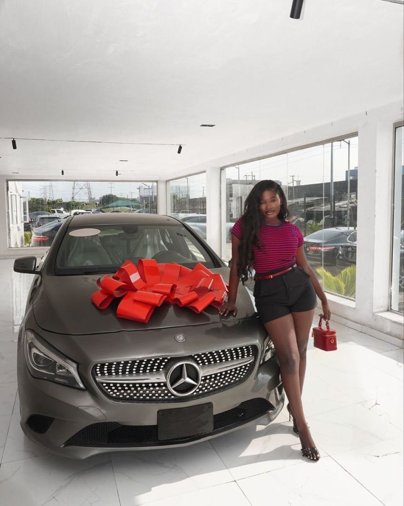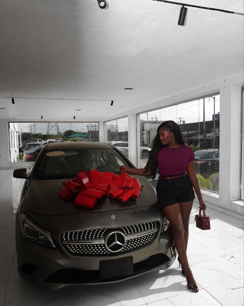 - Photos show a bow on a grey Mercedes-Benz sedan. She poses with calm pride at the showroom.