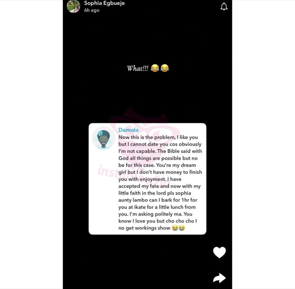 Socialite Sophia Egbueje has exchanged words with a male admirer. The chat centred on a luxury car he will not buy. Her name trended as users weighed cost, pride, and point.