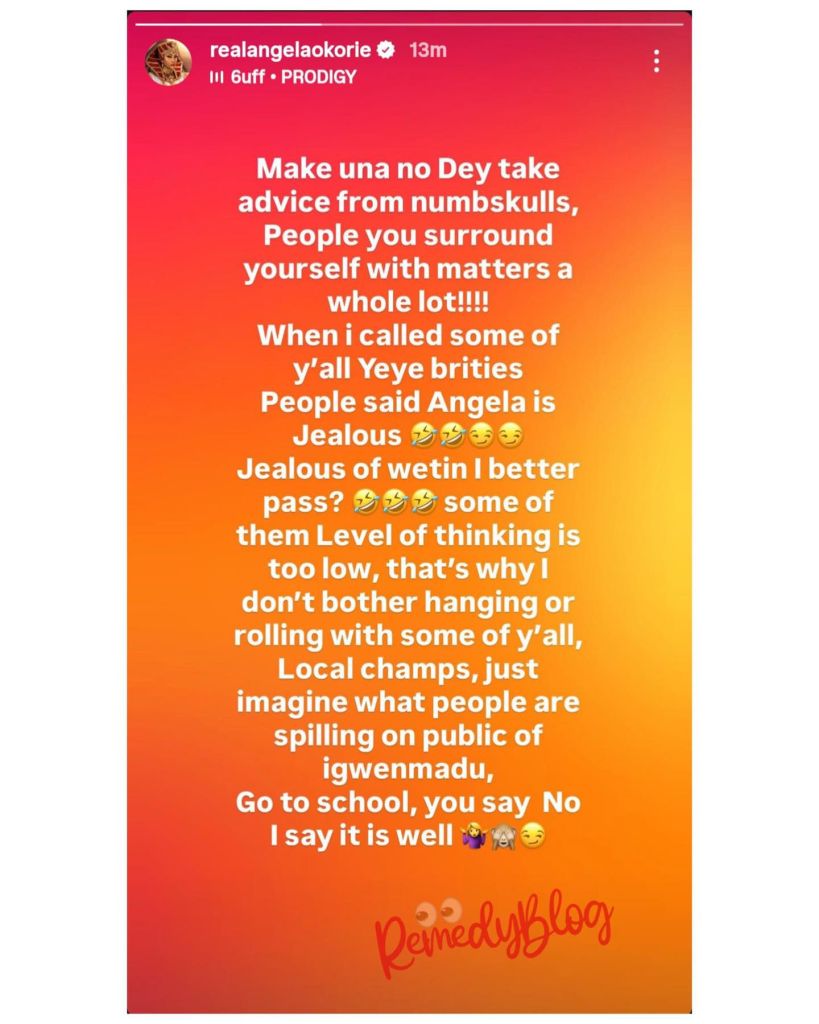 Angela Okorie has cursed out unnamed colleagues in a new Instagram Story. The Nollywood star said people called her jealous when she warned about “yeye brities” in the past.