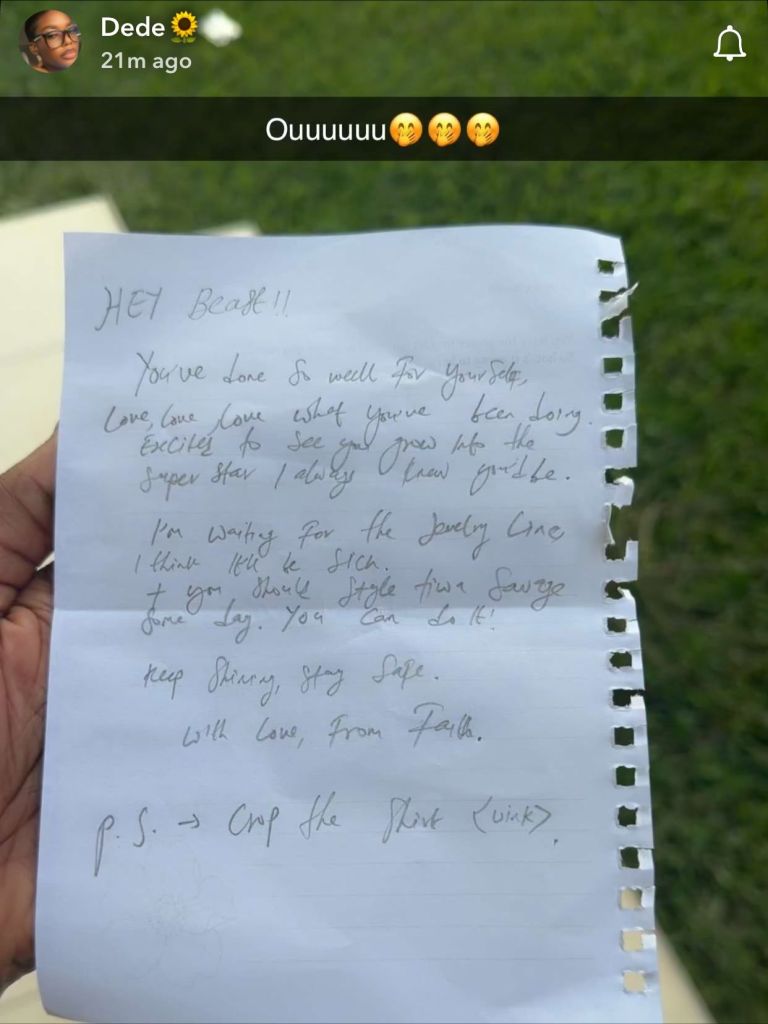 In the note Faith praises Dede for her bold style and grit. He adds playful lines and a PS that teased a photo crop.