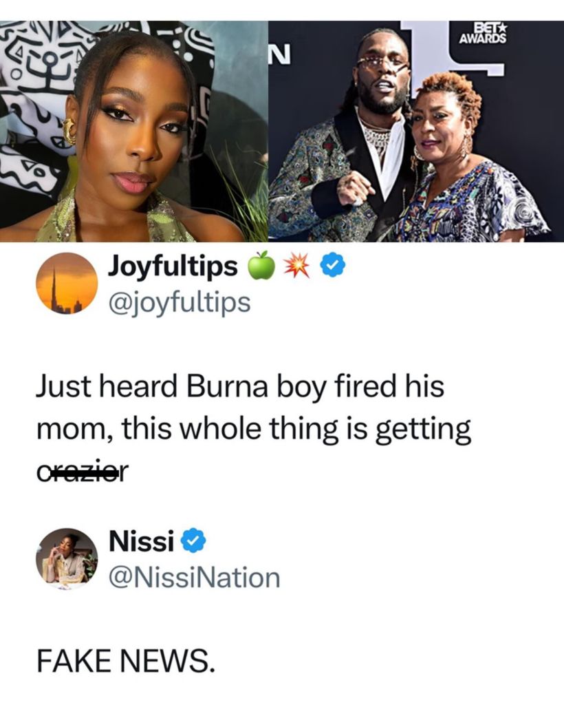 - The claim said Burna Boy had sacked their mother from management roles. Fans shared screenshots that spread the story fast online.