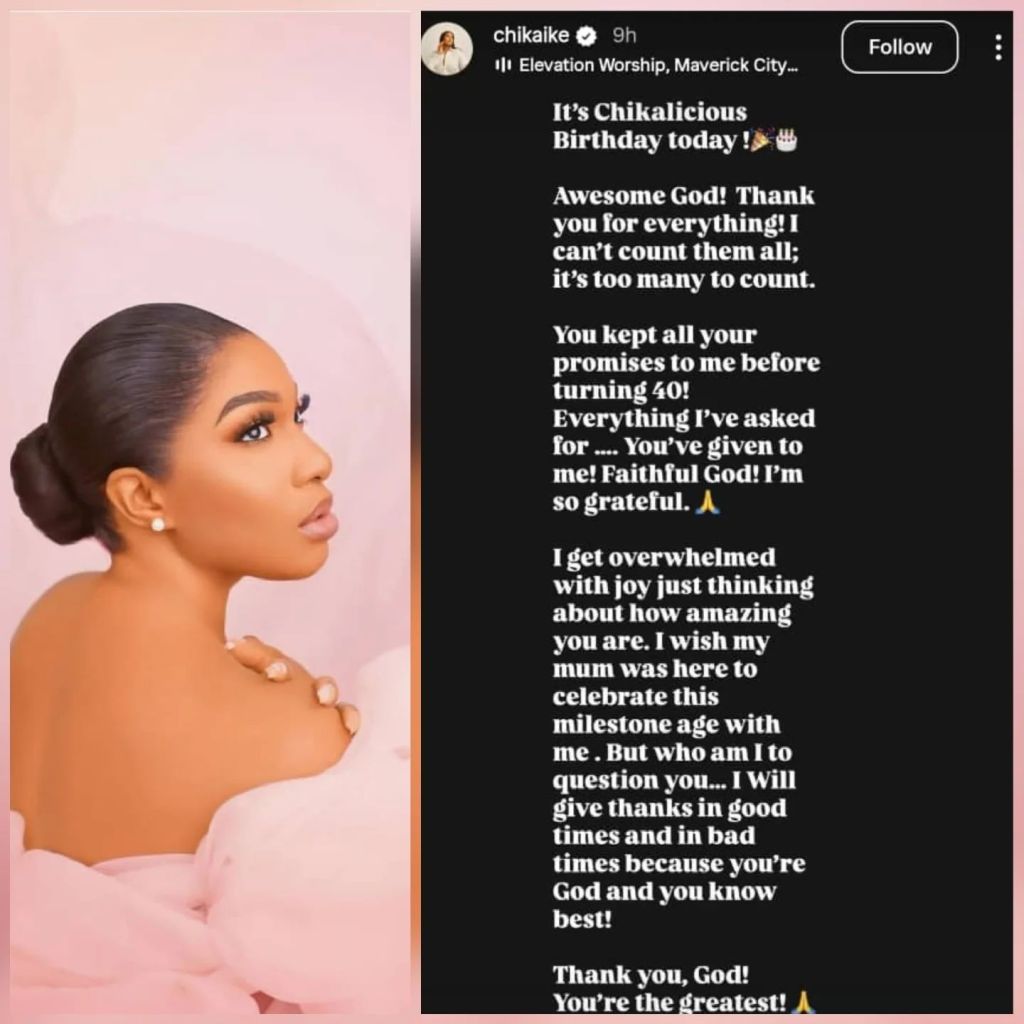 - Chika Ike shares a warm birthday message and thanks God for life. She highlights motherhood and steady guidance over the years.
