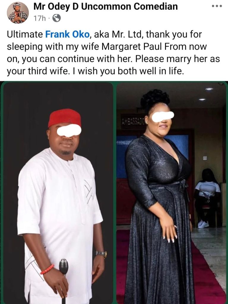 In the viral post, he named the man as Frank Oko, also called Mr Ltd. The comedian said Oko had been sleeping with his wife, Margaret Paul, for some time. He wrote that he now felt ready to let the pair continue together. It mirrors other times comedians call out cheating partners online.