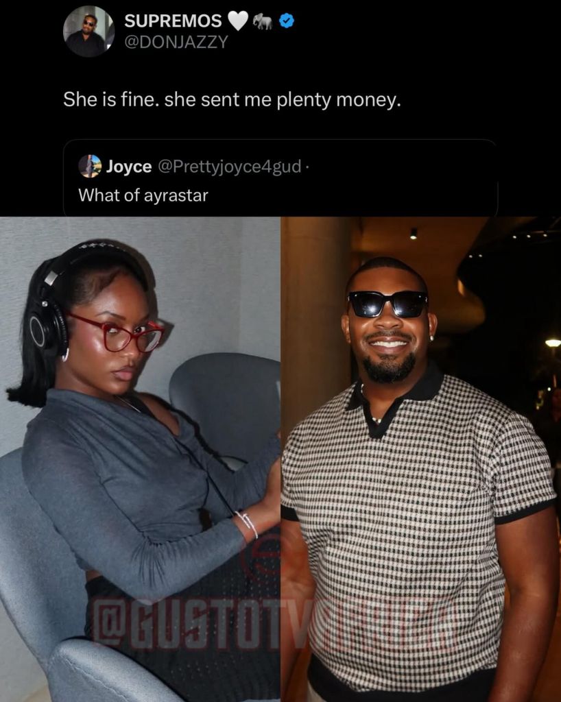 Don Jazzy (Michael Collins Ajereh) says Ayra Starr (Sarah Oyinkansola Aderibigbe) gifted him cash. He wrote that she sent him plenty of money on his birthday. The short post drew quick likes and many replies from fans.