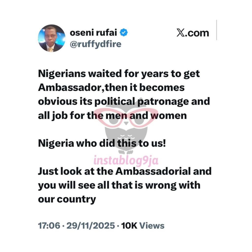 The list named both career diplomats and non-career appointees for top posts abroad. Rufai noted that many appointees are former politicians or allies rather than career staff.