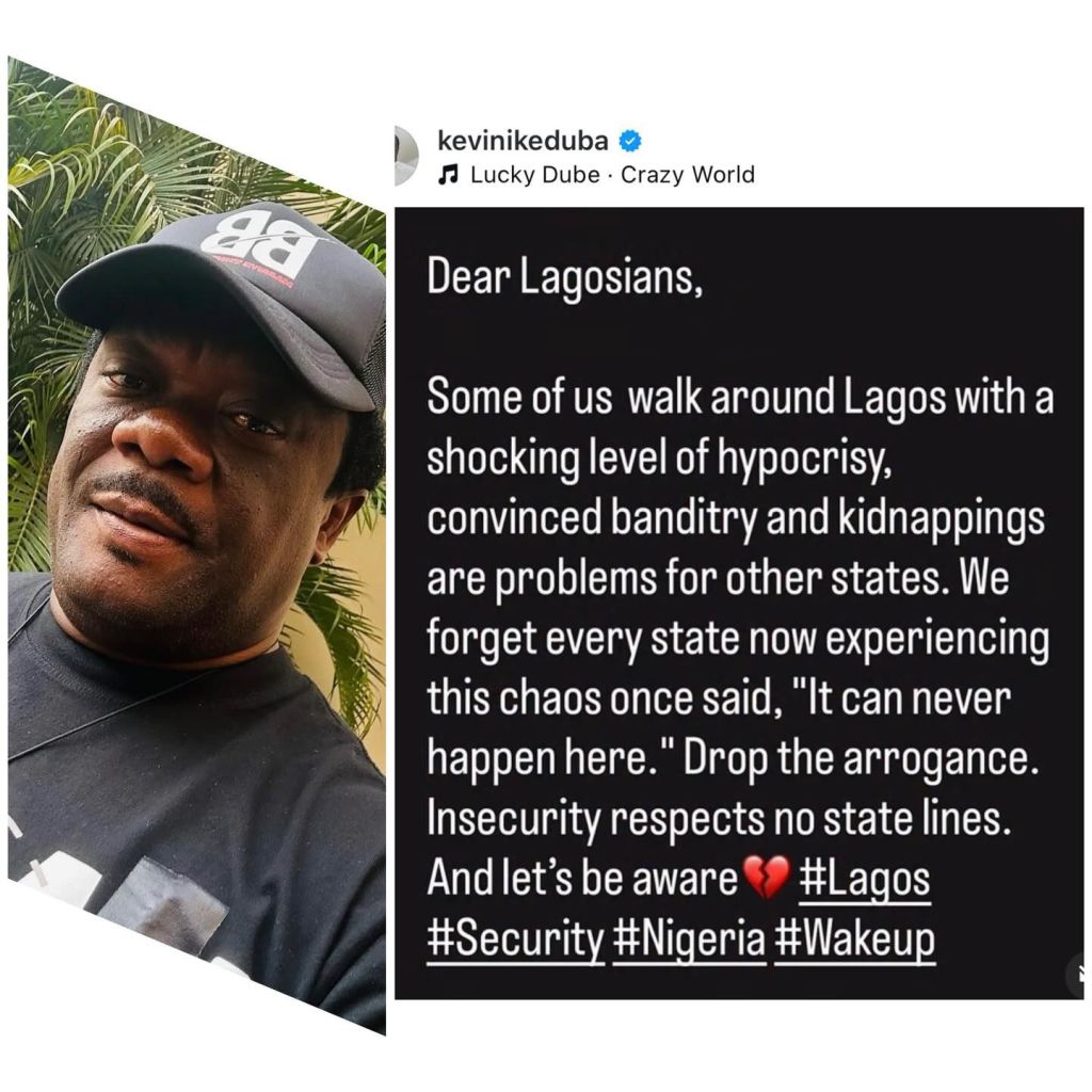 Actor Kevin Ikeduba told Lagosians that insecurity respects no state lines. He posted a long Instagram note urging humility and action.
