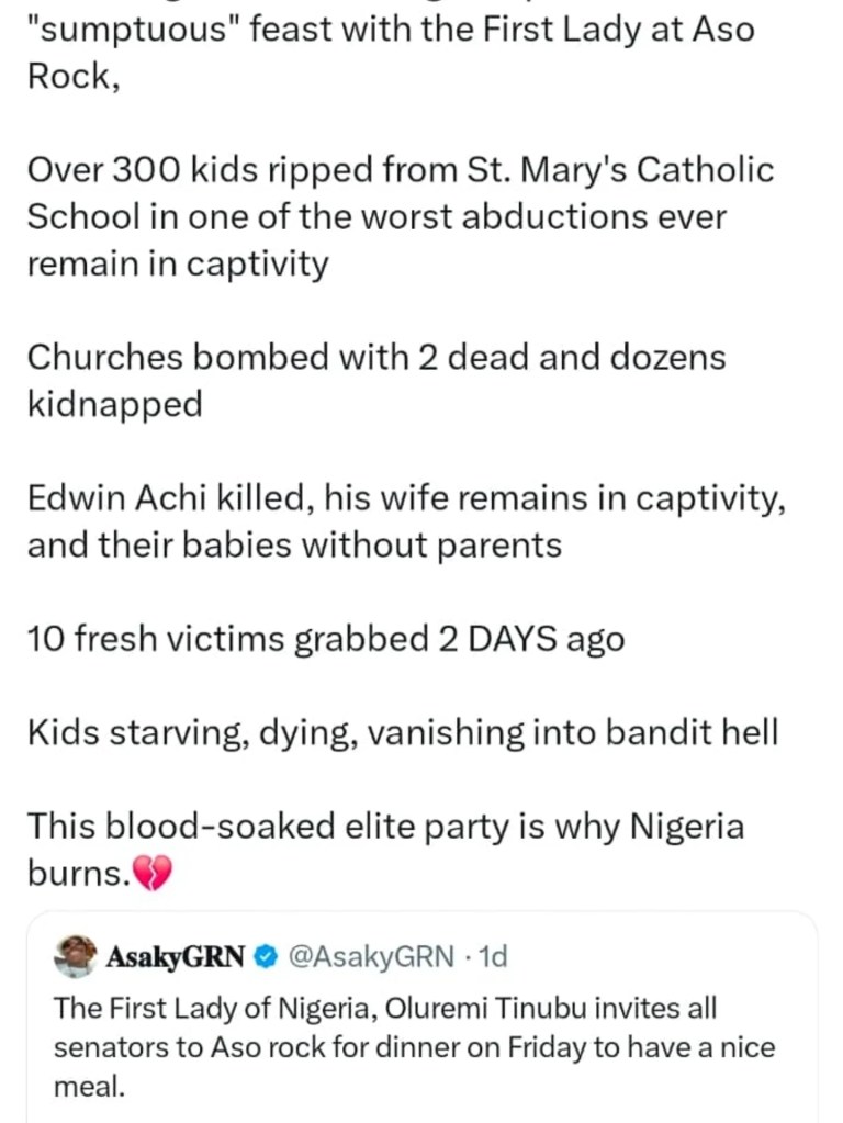 A Nigerian man posted on X after the First Lady invite surfaced. He said the dinner came as kidnappings and attacks rose across Nigeria. His post listed school abductions, church bombings and a priest killed.