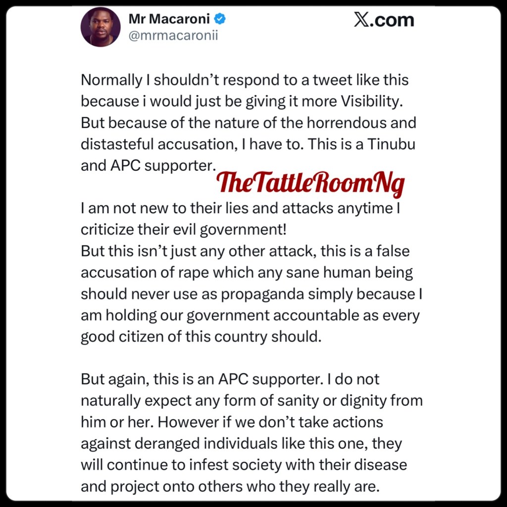 Mr Macaroni (Debo Adebayo) says a Tinubu supporter made a false rape claim against him online. He wrote that the allegation is a political smear meant to silence him.