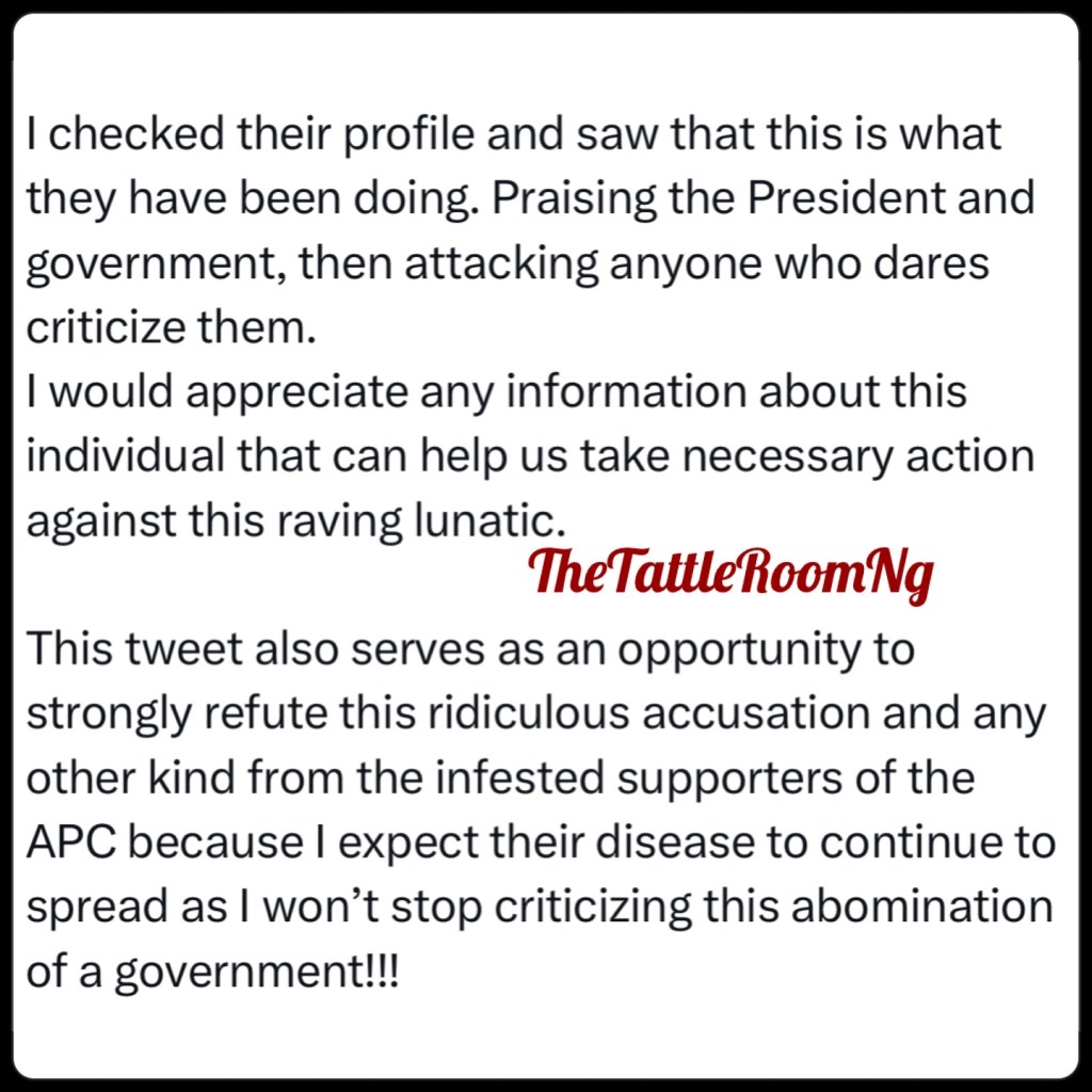 - He says the accusation is false and politically driven. He links the claim to an APC supporter online.