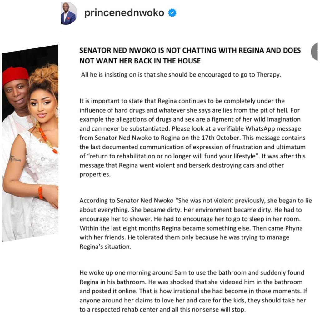 - Ned Nwoko says Regina cannot return home right now. He wants her to focus on therapy and full rehab.