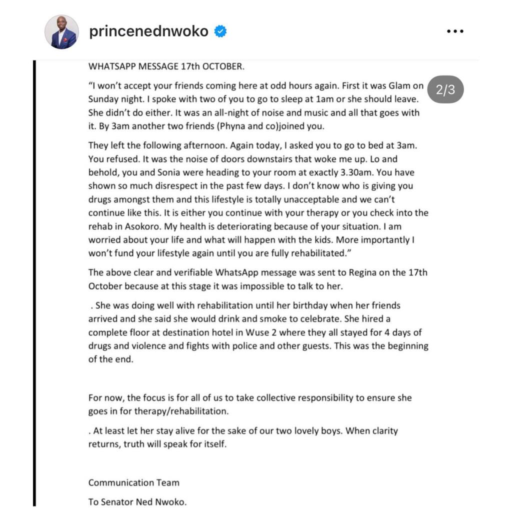 According to the message, he feared drugs among her friends and called the lifestyle unacceptable. He told her to continue therapy or check into rehab in Asokoro for proper care. He added that he would not fund her lifestyle again until she was fully rehabilitated.