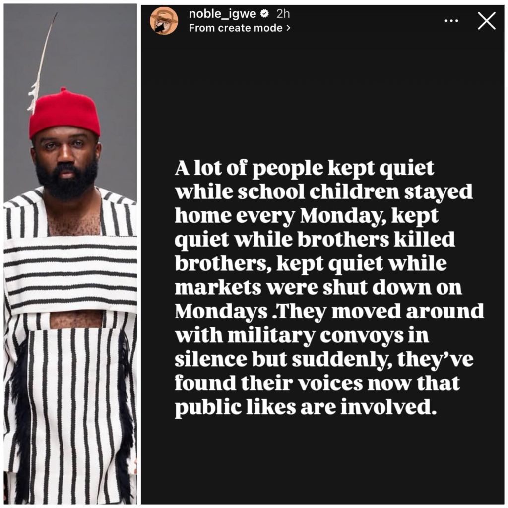Igwe said people kept quiet when children missed school and when markets shut on Mondays. He framed his point as a call for even concern for all citizens and not selective attention. Noble Igwe baptism video picks appears in recent site coverage that shows his public posts and personal events.