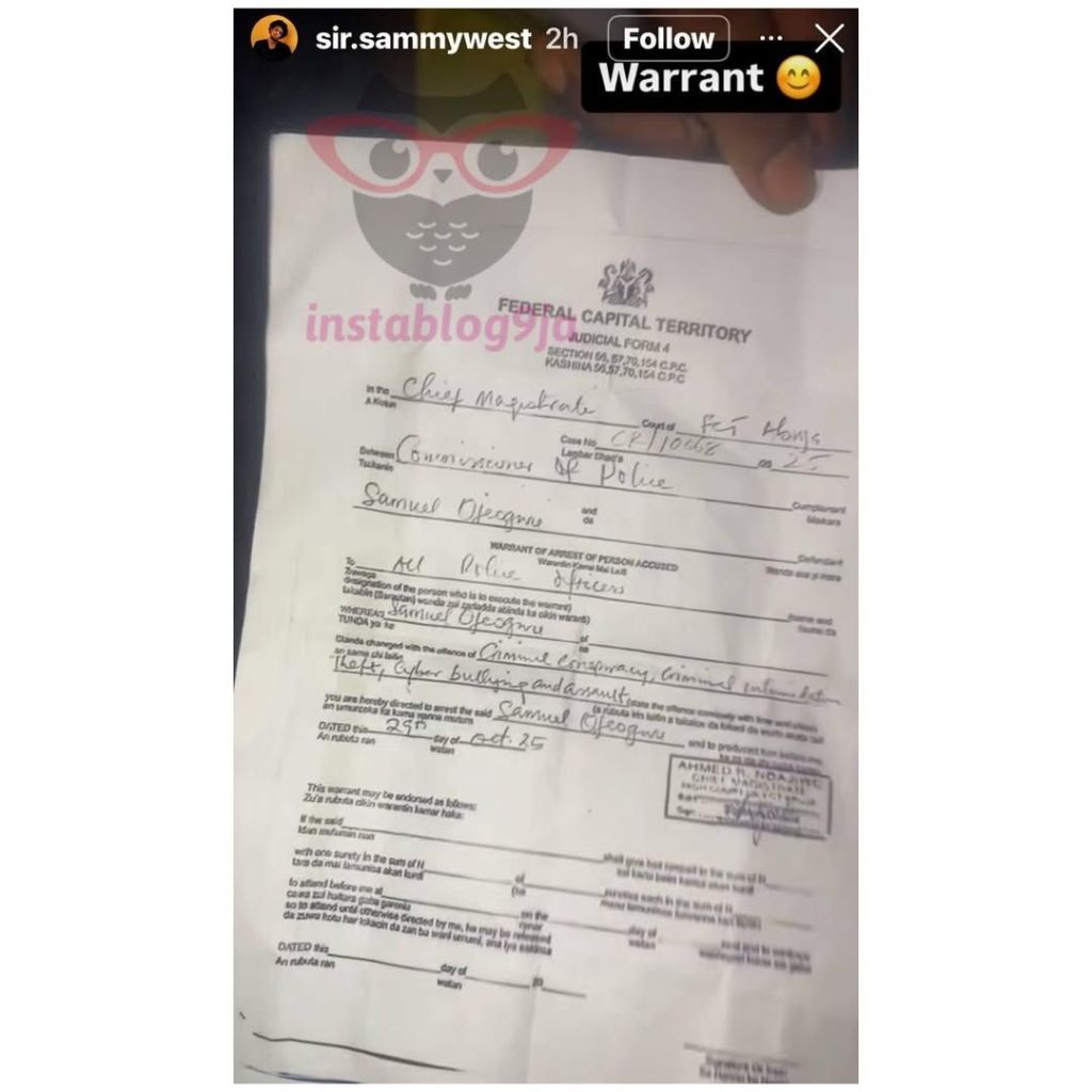 In Instagram Stories, he posted a warrant with listed charges. He said officers held him at Ogombo station. He earlier shared an earlier police invite text.