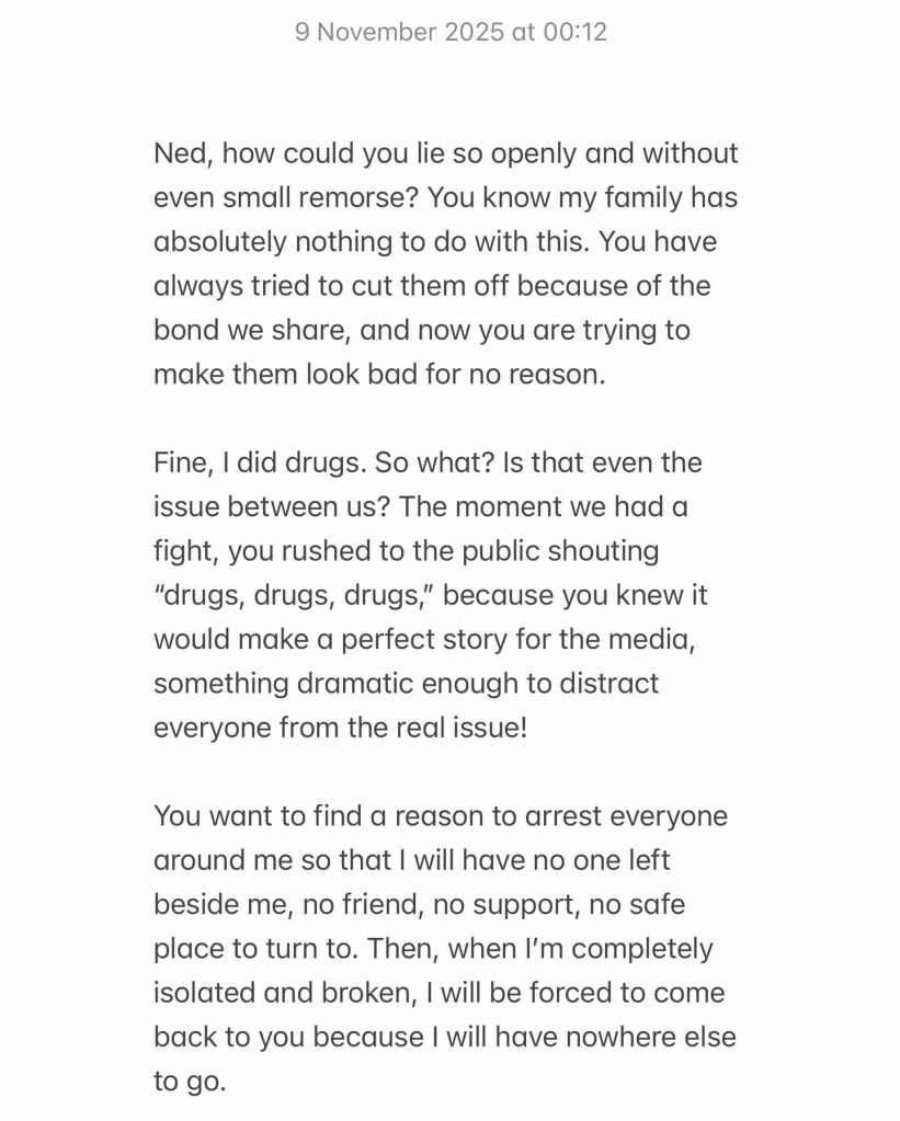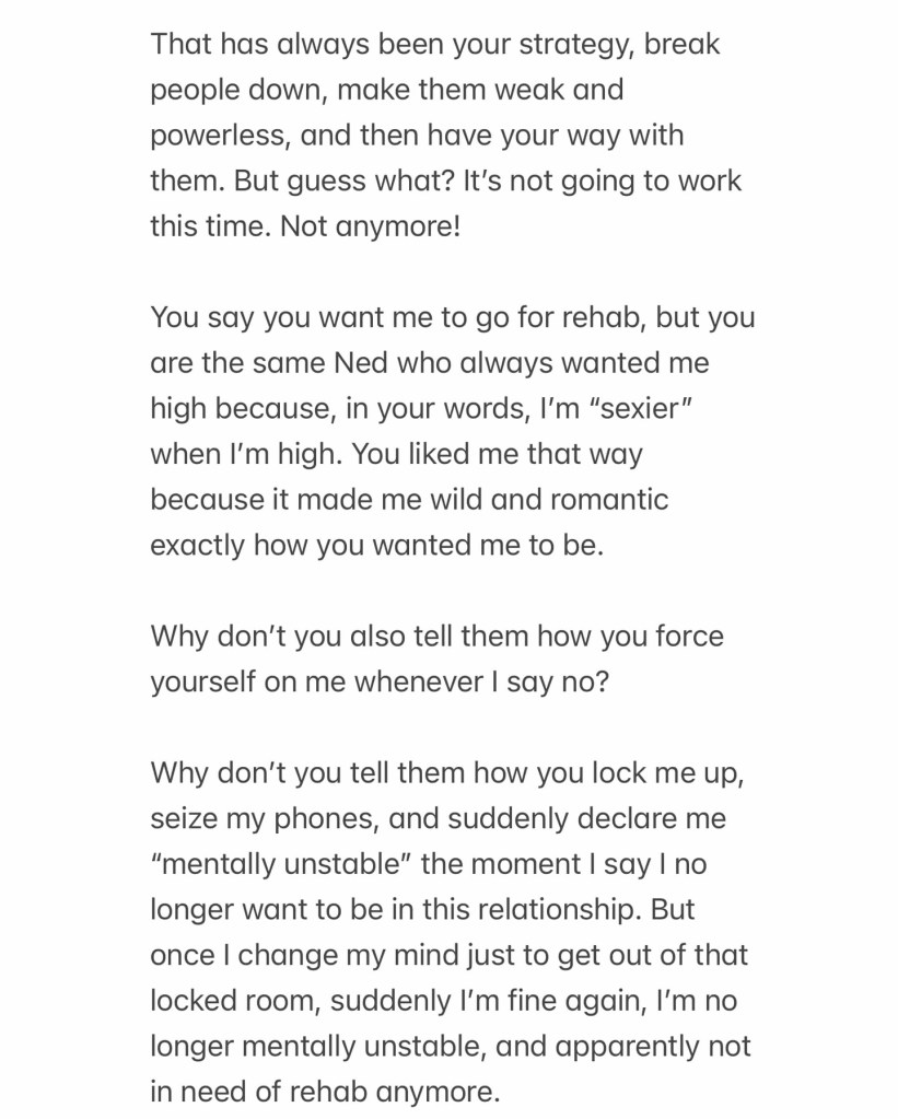 She further claims there was no legal court wedding between them. “Leave me alone, Ned,” she writes, saying love is not by force.