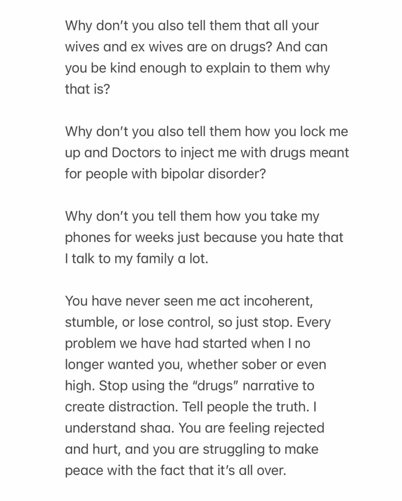The actress says every clash began when she no longer wanted him. “Stop using the drugs story,” she writes, urging him to tell the truth.
