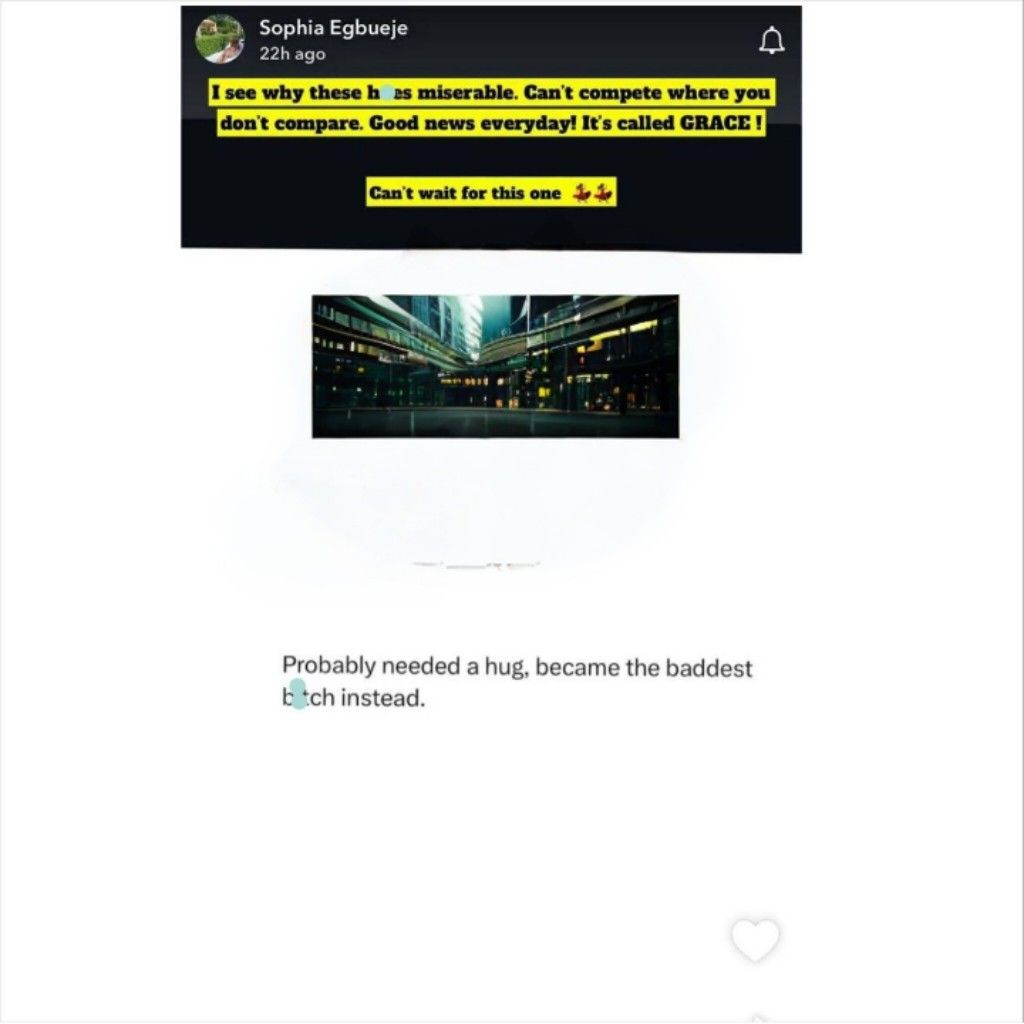 - Sophia Egbueje posts bold words to unnamed rivals. She says they cannot compare.