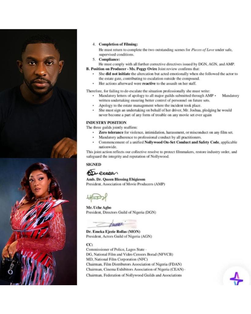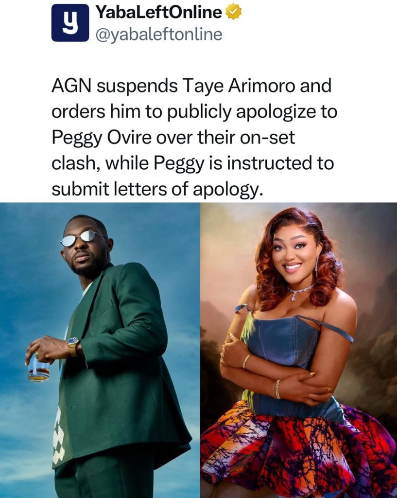 The Actors Guild of Nigeria has suspended Taye Arimoro from work. The guilds also ordered a public apology to Peggy Ovire.