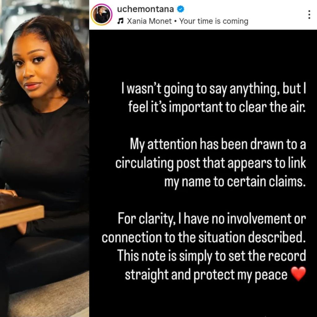 - Uche Montana denies any link to the drug claim. She posted a note to set the record straight.