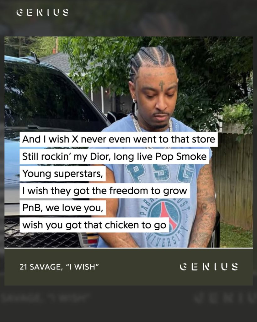 Savage recalls X and Pop Smoke early in the track. He repeats lines that sound like personal wishes. The names read as a list and as short prayers.