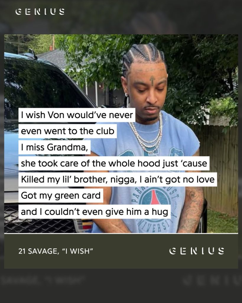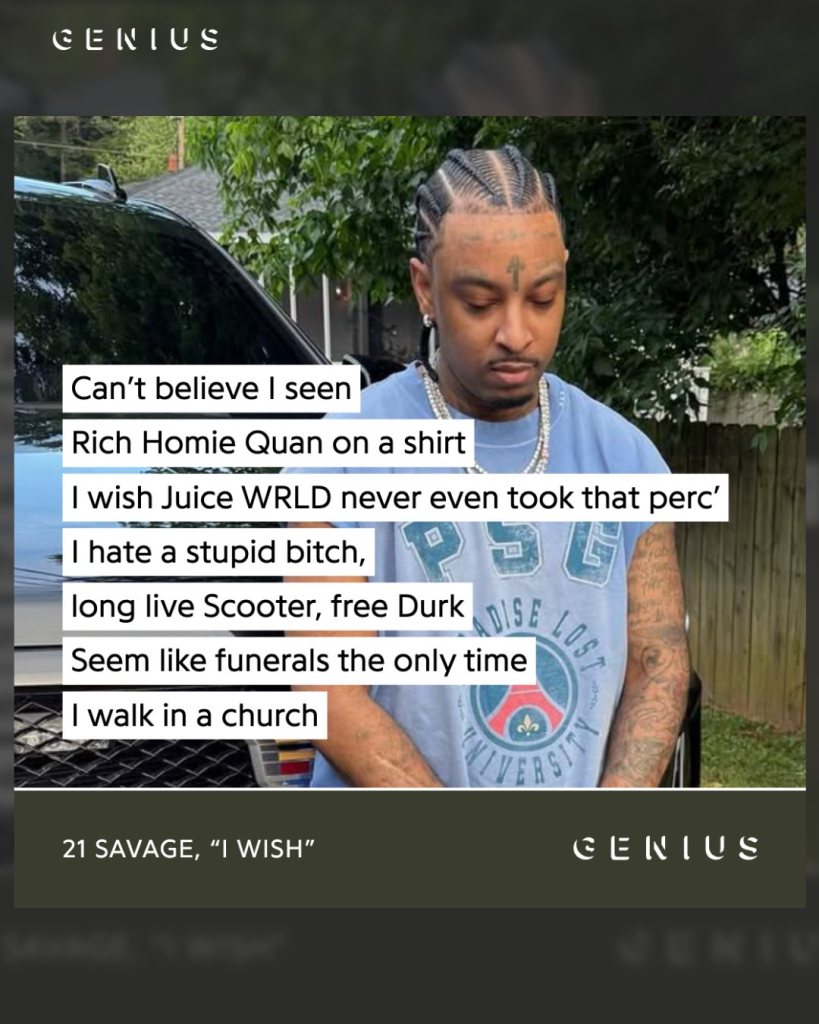 - 21 Savage lists many late artists and mourns them. The song reads like a quiet roll call.