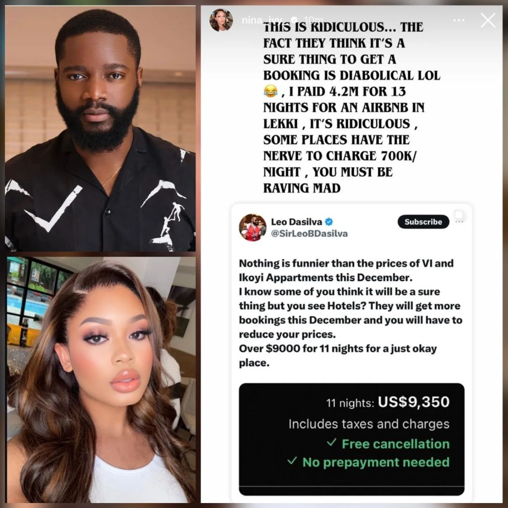 BBNaija stars Leo DaSilva and Nina have blasted the steep cost of short-let apartments in Lagos this December, saying hosts have “lost it” with their festive prices. The pair shared their shock on social media after checking rates in hot spots like Victoria Island, Ikoyi and Lekki.