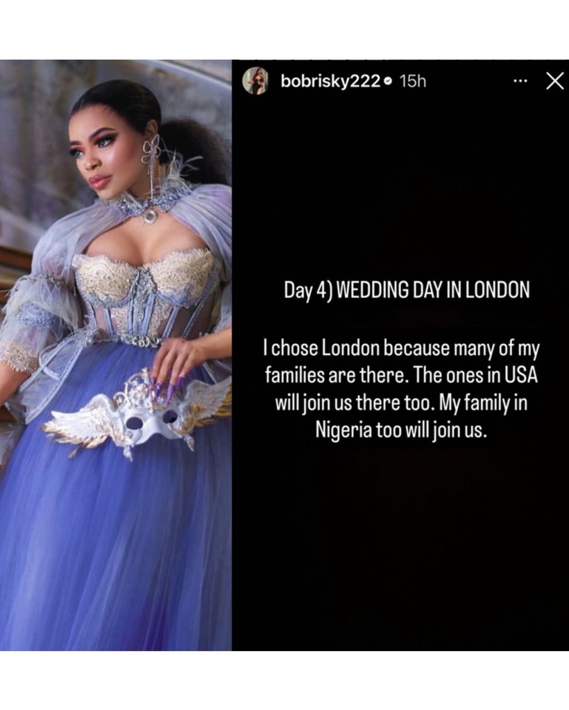 Bobrisky has already placed a price tag on the dream event. She says the wedding could cost close to one million pounds.