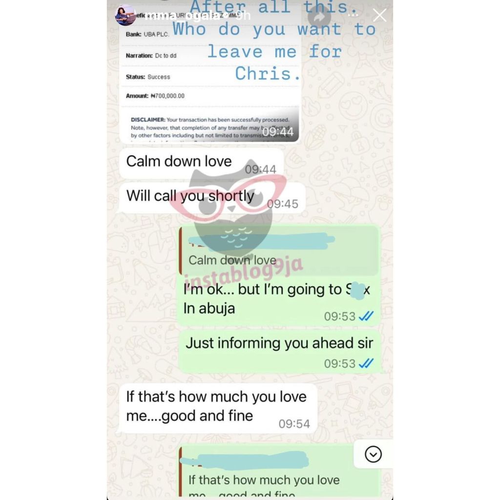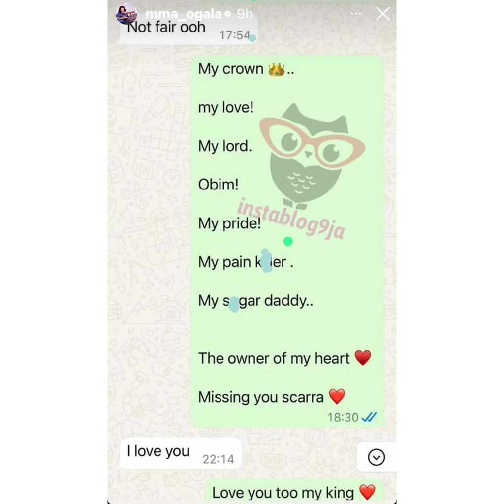 One message reads I love you in plain text. Ogala also posted a transfer receipt linked to the chats. Online pages reposted the screenshots and asked for answers.