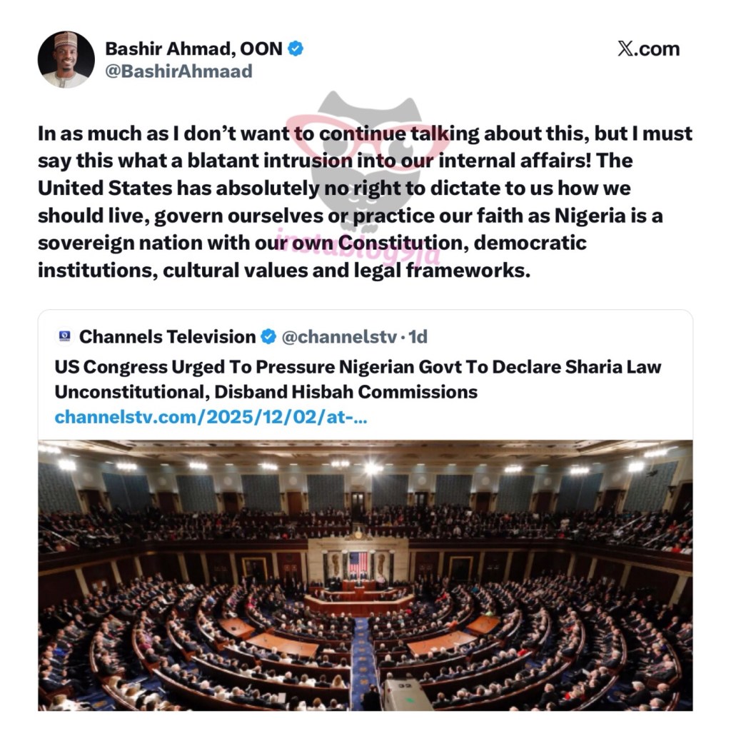 Bashir, who served as media aide to former President Muhammadu Buhari, first shared a Channels Television report on X. The story said US lawmakers were urged to push Nigeria to scrap Sharia law and disband Hisbah religious police in northern states.