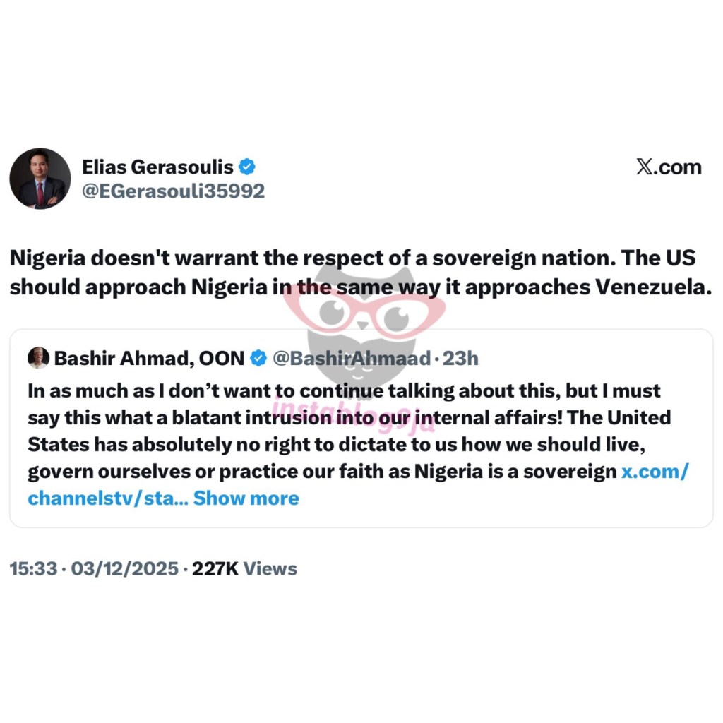 Rather than step back, Gerasoulis posted a longer message that cut even deeper. He described Nigeria as a “British made” construct designed to empower northern Muslim leaders over everyone else.