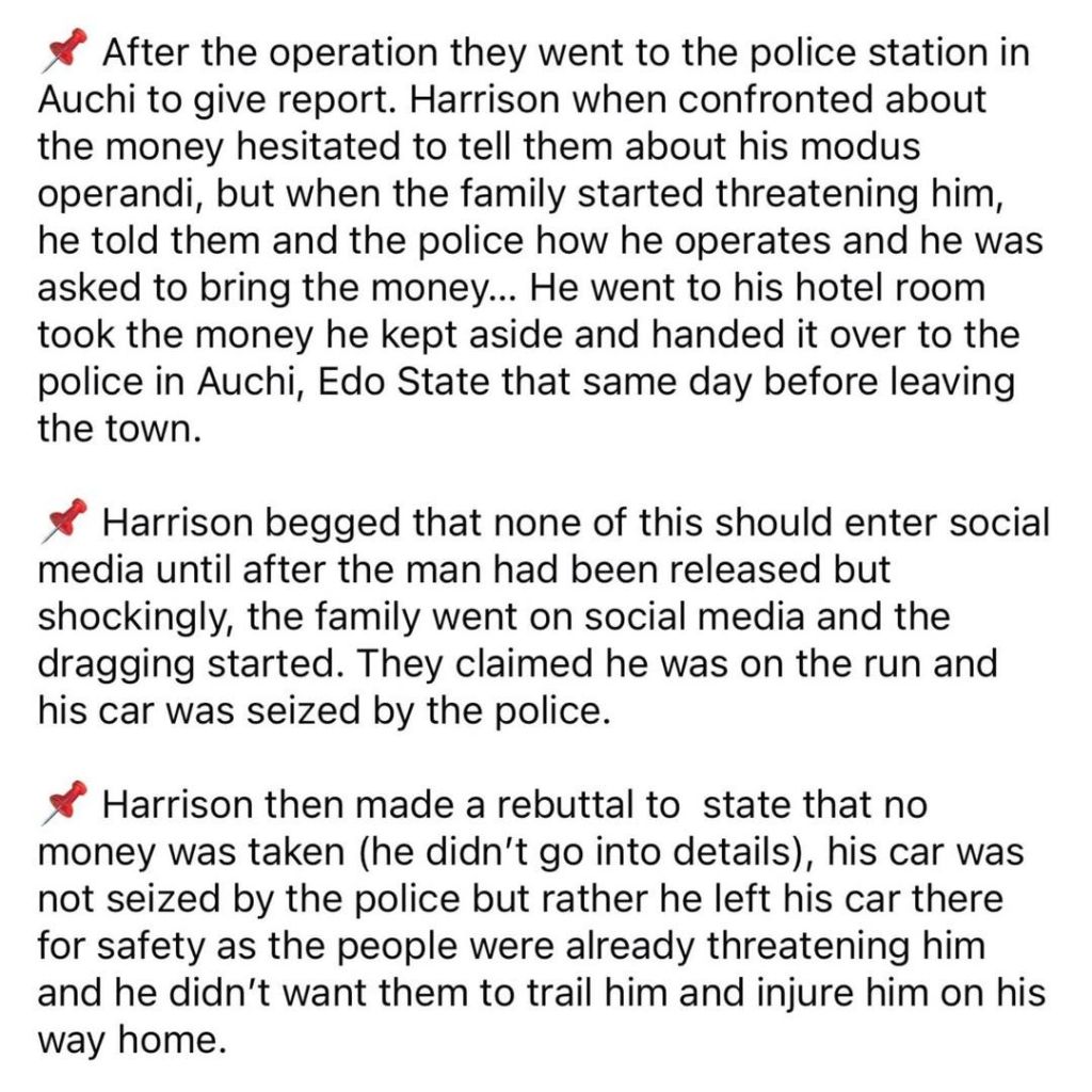 He also says officers in Benin City later staged a strange scene. They allegedly asked Harrison to act like he was returning the ransom there. Phones and cameras came out as if it were a short movie shoot.