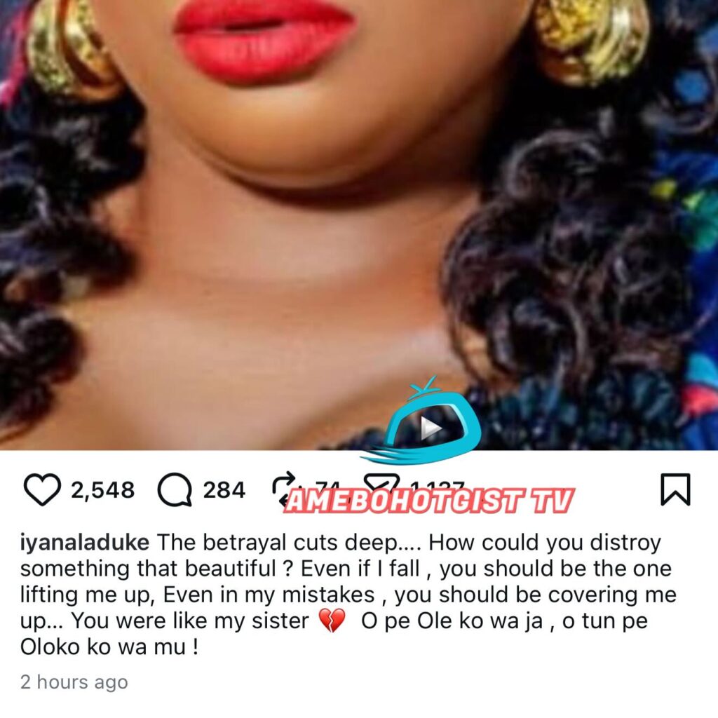 - Iyanaladuke posts a short, emotional note online today. The post says she feels deep betrayal from a friend.