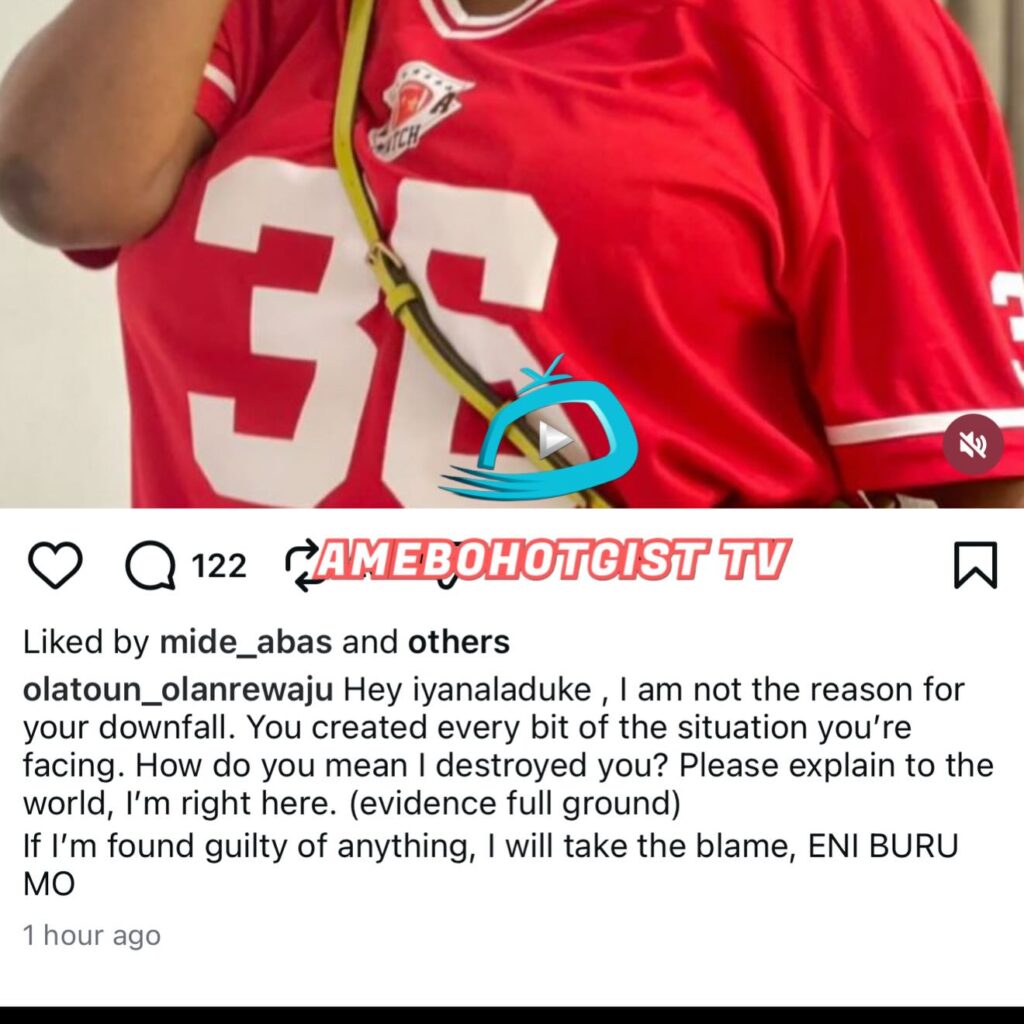 Iyana’s initial caption ran as a short, emotional note about trust and loss. Olatoun’s reply set out a stricter tone and a call for proof in public.