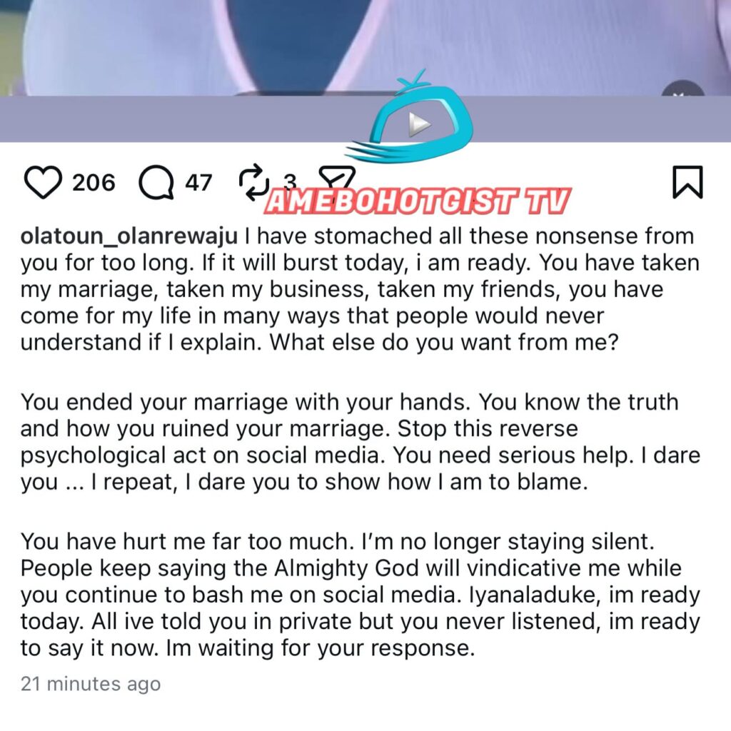 - A woman named Olatoun replies with a long, defiant post. She says she is not to blame for the split.