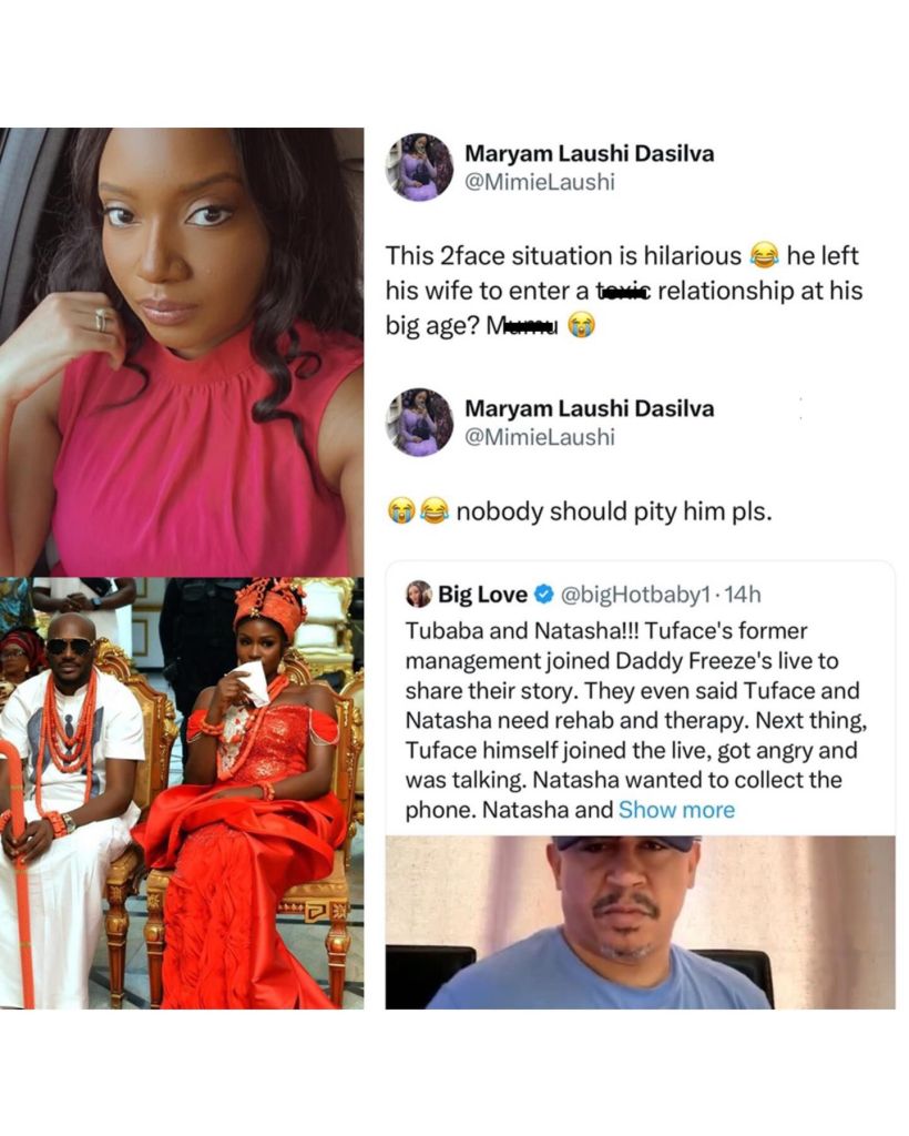 In a now-viral post, Maryam wrote that the “2face case” made her laugh. She said he left his wife to enter what she called a toxic relationship at his “big age”. The line was shared widely after blogs reposted a screenshot of her page, with many users tagging 2Baba and Natasha under the joke.