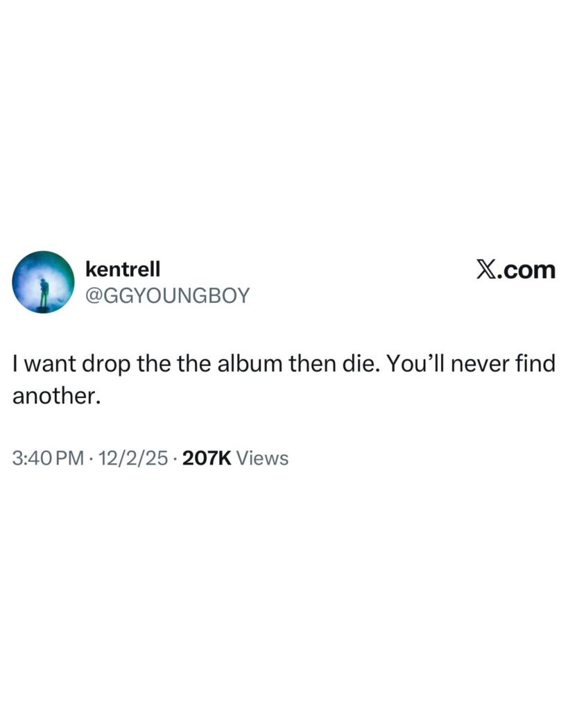 A second post from the same handle sounded more alarming. YoungBoy told fans, “I want drop the album then die.” He added that listeners “will never find another,” which many read as a farewell tone rather than normal promo talk.
