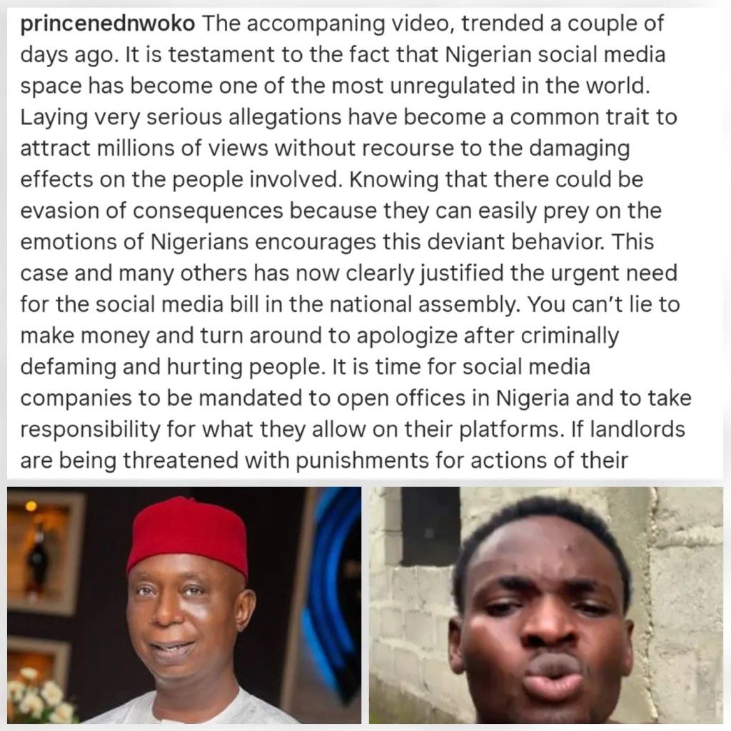 Senator Ned Nwoko has replied the young man who begged online. The man earlier claimed Nwoko paid him to harm Regina Daniels. Nwoko says the drama shows how unsafe social media now is.