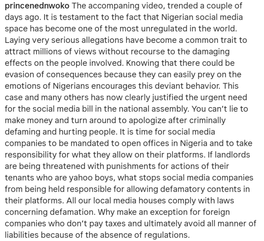 - Nwoko wants big tech firms to open offices locally. He argues they must answer for harmful posts on users.