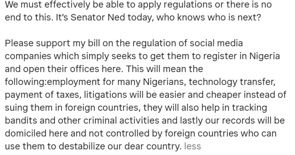 - The senator links the case to his social media bill. He says Nigeria now needs firm rules for online speech.