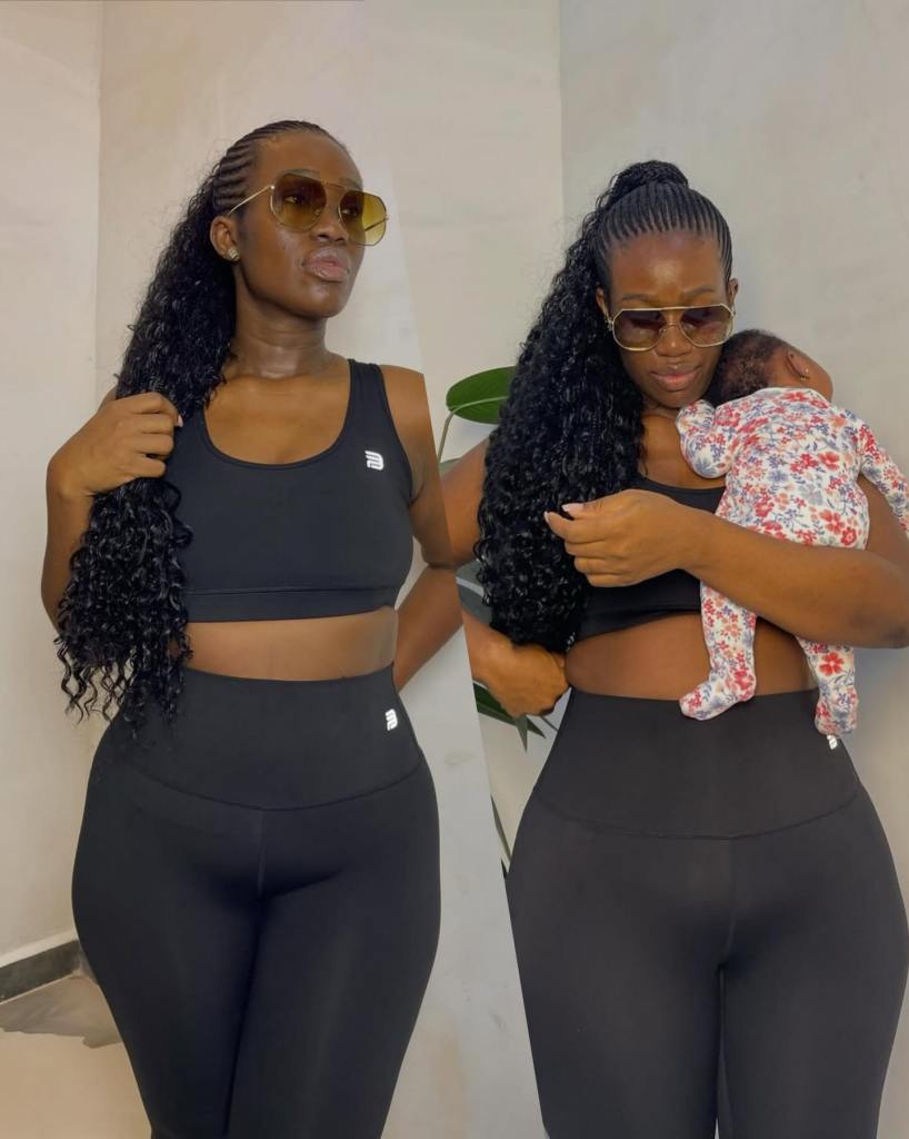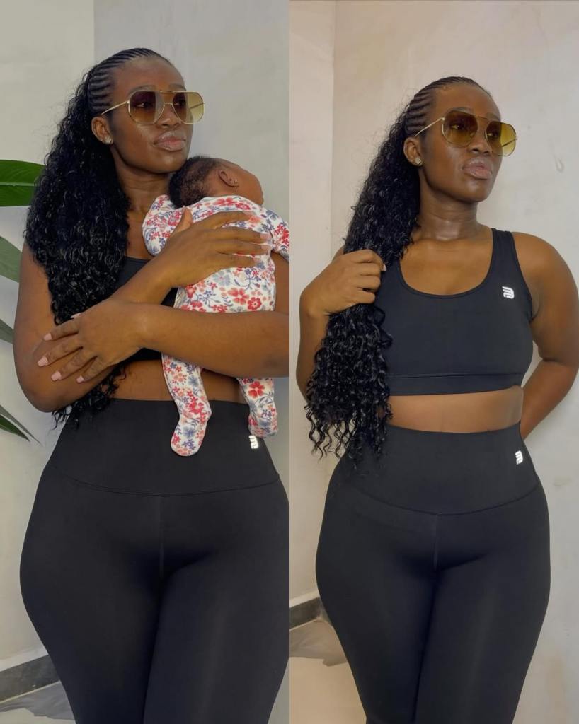 - She posts relaxed photos wearing workout wear and holding her baby. The images show a calm mother and smiling newborn.