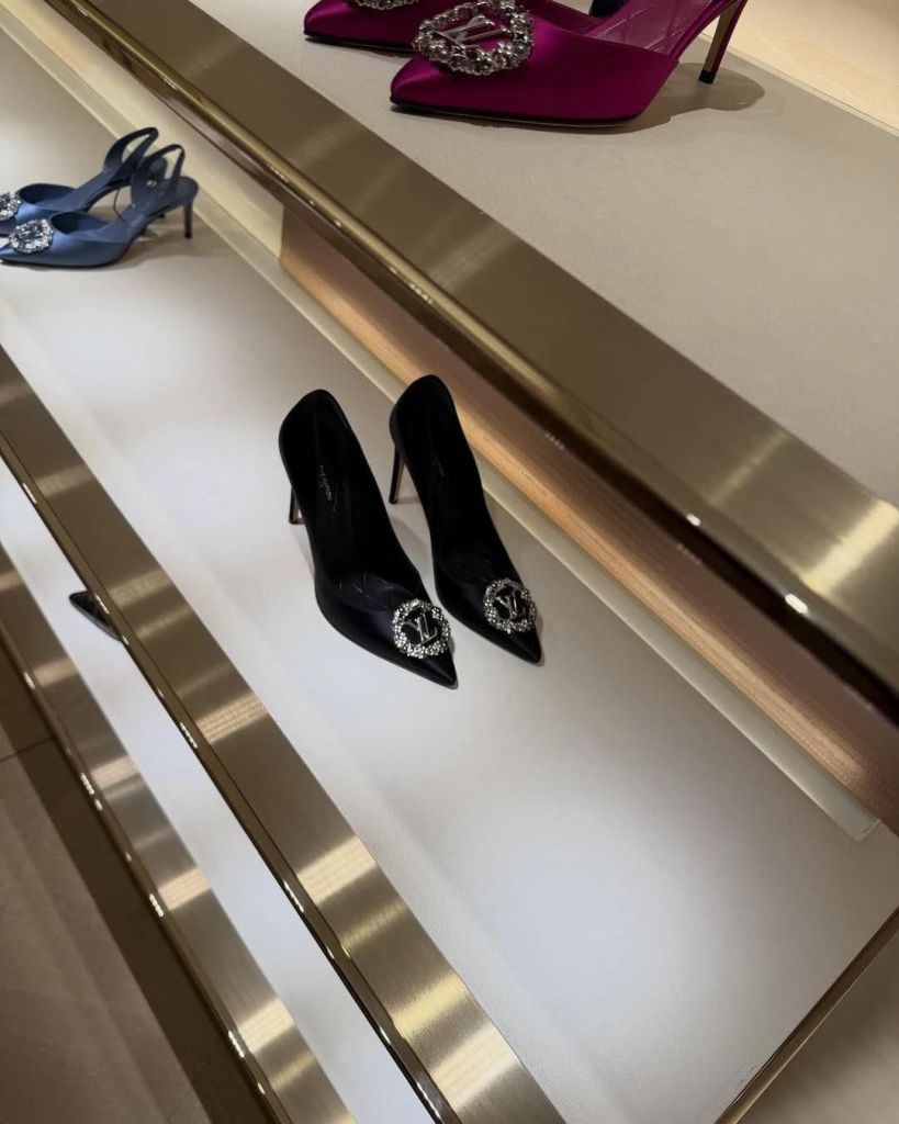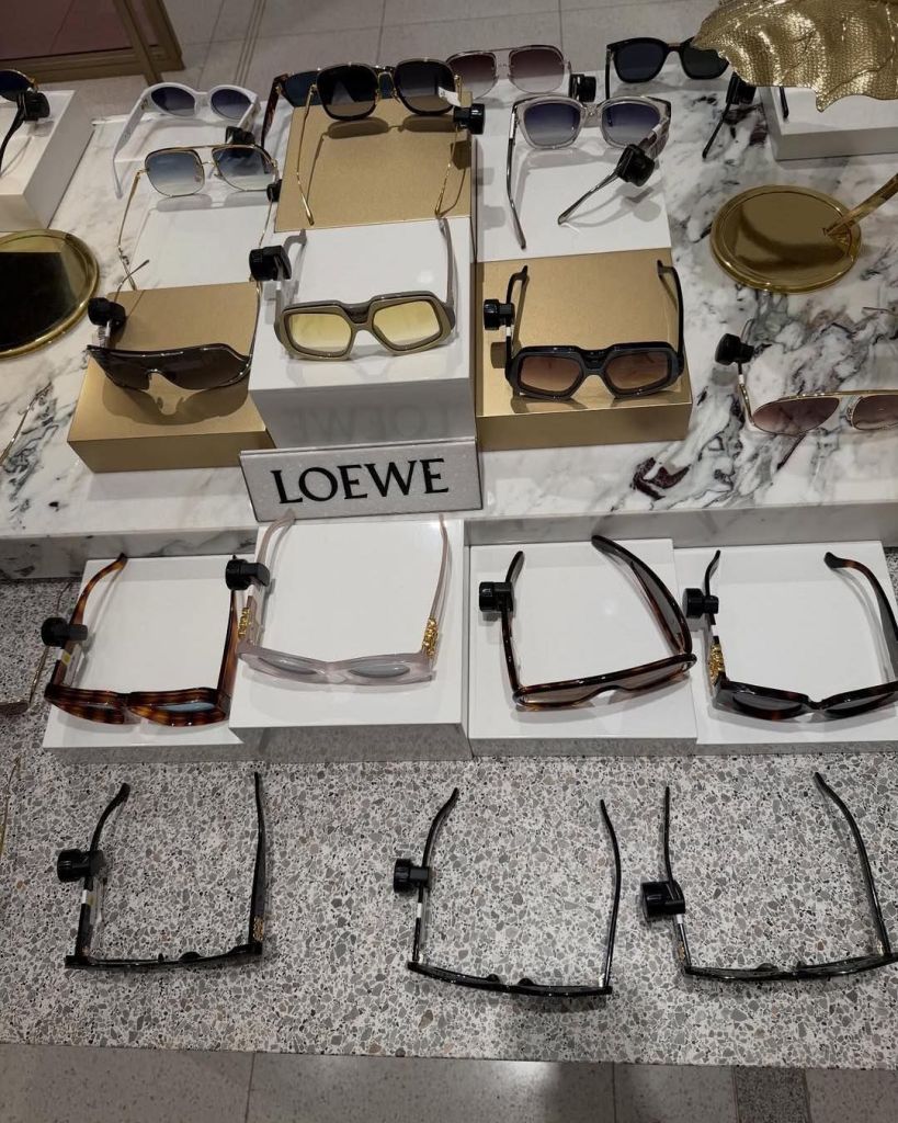 The photos show multiple sunglasses, shoes and luxury store displays. One image shows her holding several folded banknotes at the counter.