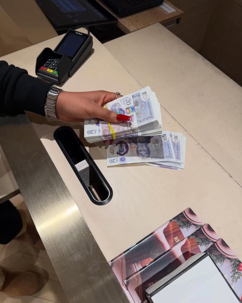 - She shows bundles of British pounds at a store counter. Some viewers said she aims to make a public point.